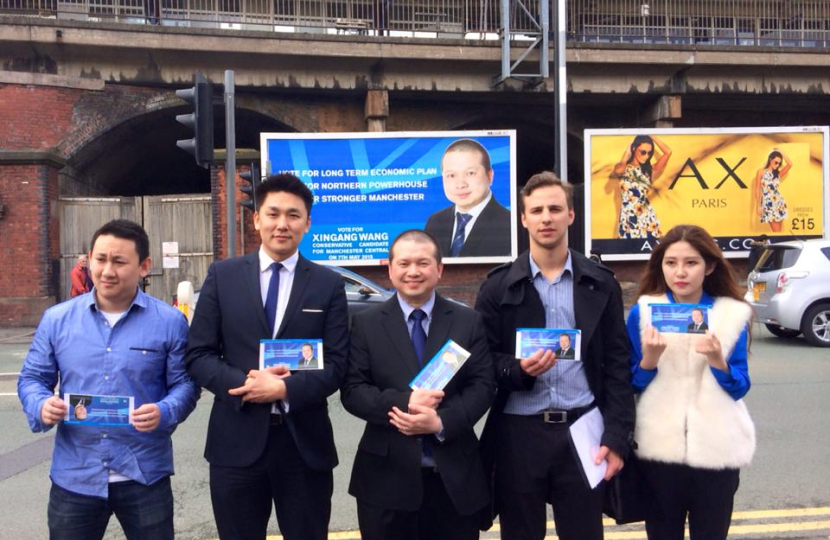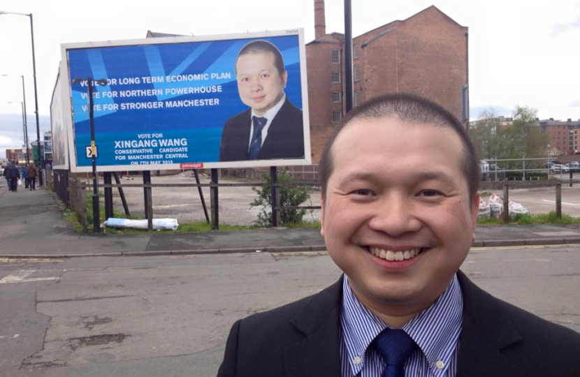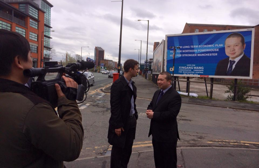 Tweet Saturday, 25 April, 2015 Articles Parliamentary candidate for Manchester Central Xingang Wang officially unveiled his campaign billboards in the presence of local Council candidates, party supporters and tv crews from BBC Chinese and Chinese Central Television.